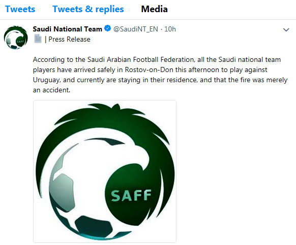 સાઉદીની નેશનલ ટીમના સત્તાવાર ટ્વિટર હેન્ડલ પર ખેલાડીઓ સુરક્ષિતત હોવાની માહિતી અપાઈ છે. ટ્વીટમાં લખવામાં આવ્યું છે કે, “સાઉદી અરબ ફૂટબોલ ફેડરેશન સૌને આશ્વસ્ત કરવા માગે છે કે વિમાનમાં ટેક્નિકલ ખરાબીના કારણે સાઉદીની નેશનલ ટીમના તમામ ખેલાડીઓ સુરક્ષિત છે.”