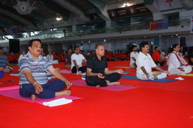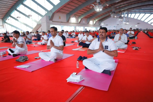 સરસાણા ખાતે મંત્રીશ્રી, મેયર, કલેકટર સહિતના નાગરિકોએ યોગાભ્યાસ કર્યો હતો