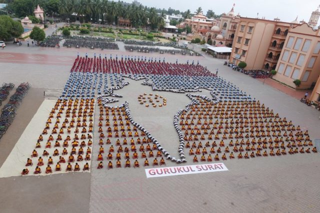 વેડરોડ ગુરૂકુલના બાળકોએ વિશ્વ યોગ દિનની ઉજવણી અંતર્ગત યોગમુદ્રા સાથે ‘ભારતના નકશા’ની વિશાળ માનવાકૃત્તિ રચી