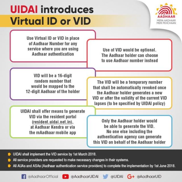 આધાર વર્ચ્યુઅલ આઈડી એક પ્રકારનો ટેમ્પરરી નંબર છે. તે 16 આંકડાનો નંબર હોય છે. તેમાં લિમિટેડ ડિટેઈલ હશે. UIDAI યૂઝર્સને દરેક આધારનો એક વર્ચ્યુઅલ આઈડી તૈયાર કરવાની તક આપશે. જો કોઈએ કોઈ જગ્યાએ આધારની ડિટેલ આપવી હોય તો 12 આંકડાના આ આધાર નંબરની જગ્યાએ 16 આંકડાનો વર્ચ્યુઅલ આઈડી આપી શકે છે. વર્ચ્યુઅલ આઈડી જનરેટ કરવાની સુવિધા 1 જૂલાઈથી અનિવાર્ય થશે.