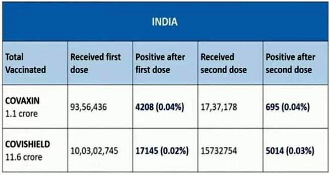 સરકારી આંકડા અનુસાર 20 એપ્રિલ 2021 સુધીમાં દેશમાં કોવિશીલ્ડ 11.6 કરોડ લોકોને આપવામાં આવી હતી. જેમાં પહેલો ડોઝ લેનાર 10.03 કરોડ લોકોમાંથી ફક્ત 1174પ લોકો જ કોરોનાગ્રસ્ત બન્યા હતાં. જે કુલ સંખ્યાનાં માત્ર 0.02 ટકા જ છે. કોવિશીલ્ડનો બીજો ડોઝ લેનાર 1.પ7 કરોડ લોકોમાંથી પ04 લોકોને રસી લીધા પછી સંક્રમણ લાગ્યું હતું. જે કુલ સંખ્યાનાં માત્ર 0.03 ટકા છે.