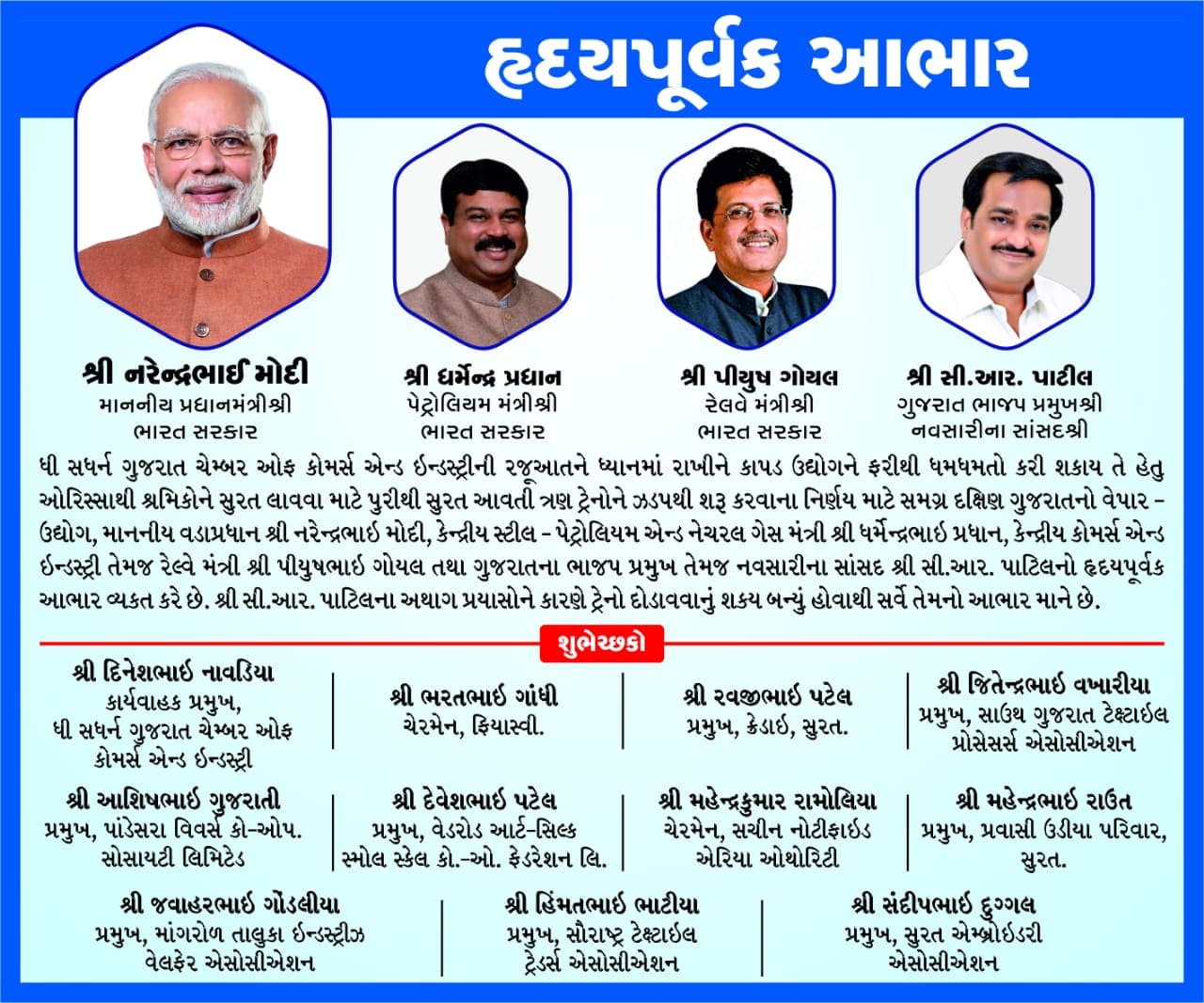 ગત માર્ચ 2020માં કોરોના પેન્ડેમિક અને લૉકડાઉનની સ્થિતિને કારણે સુરતથી પોતાના વતન ઓરીસ્સા પરત ફરેલા કામદારોને હવે ઝડપભેર સુરત પરત લાવવામાં નહીં આવે તો ઉદ્યોગોને પારાવાર નુકસાન થાય તેમ છે. આવી સ્થિતિમાં ઓરિસ્સાથી કામદારો ઝડપભેર પરત ફરે તે માટે ટ્રેન વ્યવહાર જરૂરી હોવાથી સુરતના સધર્ન ગુજરાત ચેમ્બર ઓફ કોમર્સ એન્ડ ઇન્ડસ્ટ્રીઝના નેજા હેઠળ વિવિધ યુનિયનોએ સુરત-નવસારીના સાંસદ શ્રી સી.આર. પાટીલની મધ્યસ્થી સાથે કેન્દ્ર સરકારને રજૂઆતો કરી હતી. આ રજૂઆતો ફળદાયી રહી છે અને કેન્દ્ર સરકારે ઓરીસ્સાથી સુરત ત્રણ સ્પેશયલ ટ્રેન કામદારો માટે જ શરૂ કરવાની પ્રક્રિયા હાથ ધરી છે. આથી ચેમ્બર ઓફ કોમર્સ સમેત સુરતના જુદાજુદા એસોસીએશનોએ કેન્દ્ર સરકાર, વડાપ્રધાન શ્રી મોદી, પેટ્રોલિયમ મંત્રી શ્રી ધર્મેન્દ્રપ્રધાન, રેલવે મંત્રી શ્રી પિયુષ ગોયલ તેમજ નવસારીના સાંસદ શ્રી સી.આર. પાટીલનો આભાર માંગતુ નિવેદન પ્રગટ કર્યું છે.