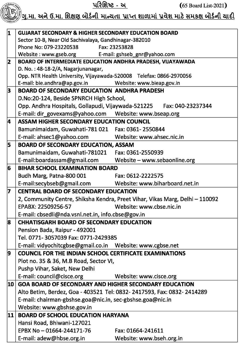 ગુજરાત માધ્યમિક શિક્ષણ બોર્ડે હાલ ચાલી રહેલી ધો.11ની પ્રવેશ કાર્યવાહી અન્વયે શાળાના આચાર્યોને માર્ગદર્શન આપવા માટે દેશભરમાં આવેલા વેલીડ માધ્યમિક શિક્ષણ બોર્ડ (સેકન્ડરી એજ્યુકેશન બોર્ડ)ની યાદી જાહેર કરી છે. અગાઉ 62 બોર્ડ ભારતમાં વેલીડ એટલેકે માન્યતા પ્રાપ્ત હતા હવે માન્ય માધ્યમિક શિક્ષણ બોર્ડની સંખ્યા 65ની થઇ છે. જેની નામાવલી અત્રે પ્રસ્તુત છે આ સિવાય બાકીના તમામ બોર્ડ બોગસ ગણાશે અને તેમાંથી ધો.10 પાસ કર્યાની માર્કશીટ રજૂ કરનારને કોઇ શાળા કે ડિપ્લોમા કોલેજમાં પ્રવેશ મળી શકશે નહીં.