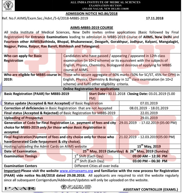 એઇમ્સ 2019 પ્રવેશ પરીક્ષા માટે તા.25 અને તા.26મી મે, 2019 મુકરર કરવામાં આવી છે.