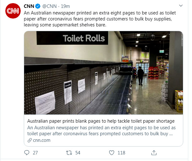 લોકો ટોઇલેટ પેપર તરીકે ઉપયોગ કરી શકે એ માટે અખબારના 8 પાના કોરા છાપનાર ઓસ્ટ્રેલિયન અખબાર એન.ટી. ન્યુઝના એડીટર મેટ વિલિયમ્સે જણાવ્યું કે અમે ઇરાદાપૂર્વક આઠ પાના કોરા છાપ્યા છે. ઓસ્ટ્રેલિયામાં ટોઇલેટ પેપરની ભારે કમી છે. મોલ્સમાં એક ગ્રાહકને વધુમાં વધુ 4 રોલ્સ ટોઇલેટ પેપર મળે છે. પબ્લિક ટોઇલેટમાં ટોઇલેટ પેપર્સ આઉટ ઓફ સ્ટોક છે. આવી સ્થિતિમાં અમારી ફરજ છે કે અમે અમારા કસ્ટમર્સને કોઇપણ રીતે ઉપયોગી નિવડીએ.