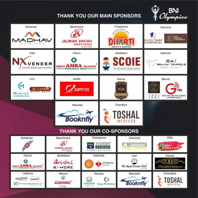 BNI સુરત ઓલમ્પિક્સના મેઇન સ્પોન્સર્સ તેમજ કો-સ્પોન્સર્સ પર નજર કરીએ તો દરેક ચેપ્ટર દીઠ એક મેઇન સ્પોન્સર્સ રહ્યા છે. જેમાં