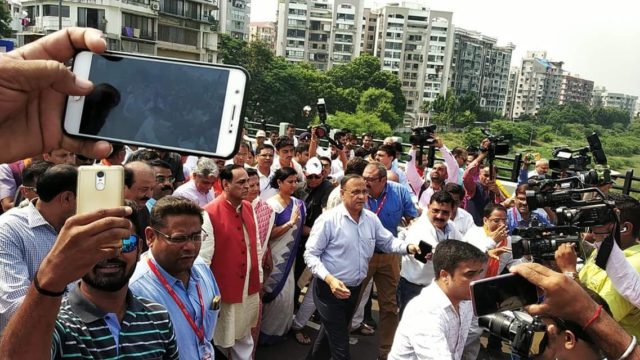 બ્રિજનું ઉદઘાટન કરવા માટે જઇ રહેલા મુખ્યમંત્રી વિજય રુપાણી સાથે સ્થાનિક આગેવાનો દ્રશ્યમાન છે