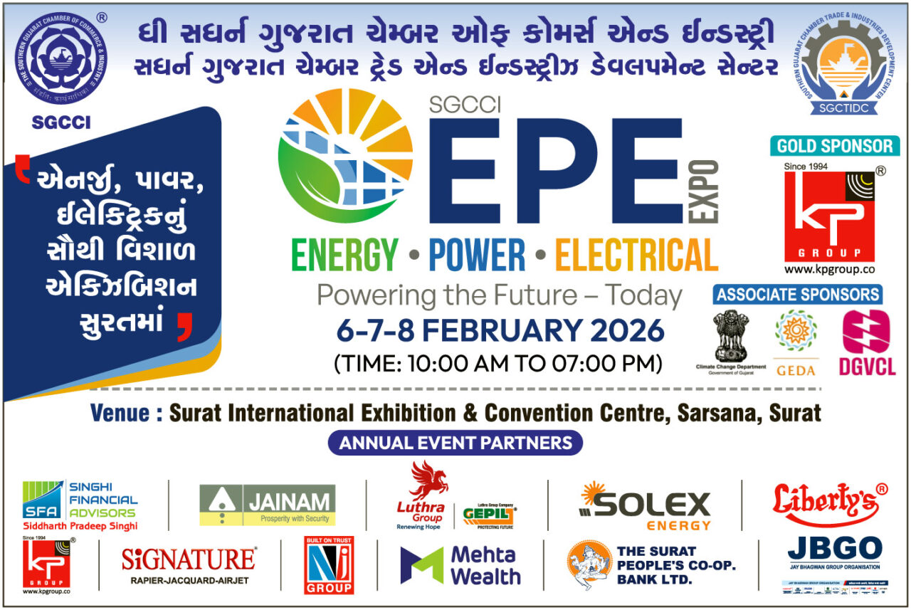 સુરતઃ ધી સધર્ન ગુજરાત ચેમ્બર ઓફ કોમર્સ એન્ડ ઇન્ડસ્ટ્રી અને સધર્ન ગુજરાત ચેમ્બર ટ્રેડ એન્ડ ઇન્ડસ્ટ્રીઝ ડેવલપમેન્ટ સેન્ટરના સંયુકત ઉપક્રમે તા. ૬, ૭ અને ૮ ફેબ્રુઆરી, ર૦ર૬ના રોજ સવારે ૧૦:૦૦થી સાંજે ૭:૦૦ કલાક દરમ્યાન સુરત ઇન્ટરનેશનલ એકિઝબિશન એન્ડ કન્વેન્શન સેન્ટર, સરસાણા, સુરત ખાતે ‘એનર્જી–પાવર–ઇલેકિટ્રકલ એક્ષ્પો ર૦ર૬’નું આયોજન કરવામાં આવ્યું છે.