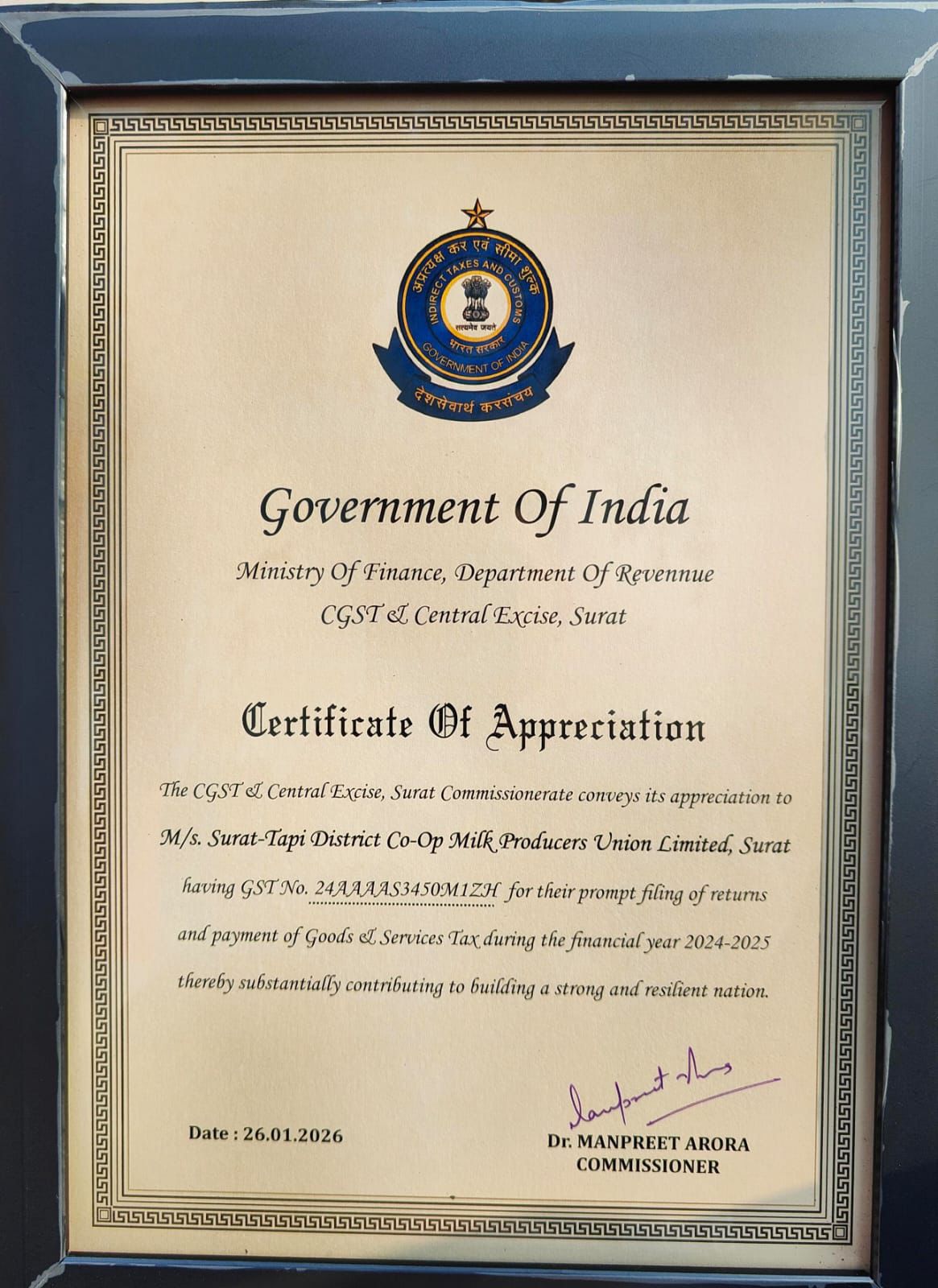 77મા ગણતંત્ર દિવસના અવસરે સુરત–તાપી જિલ્લા સહકારી દૂધ ઉત્પાદક સંઘ લિ. (સુમુલ ડેરી)ને ભારત સરકારના નાણાં મંત્રાલયના આવક વિભાગ હેઠળના CGST અને સેન્ટ્રલ એક્સાઇઝ, સુરત કમિશનરેટ દ્વારા પ્રશંસા પ્રમાણપત્ર એનાયત કરવામાં આવ્યું. આ સન્માન આર્થિક વર્ષ 2024–25 દરમિયાન GST રિટર્ન સમયસર ફાઇલ કરવા તેમજ GST ની નિયમિત ચુકવણી બદલ આપવામાં આવ્યું છે.