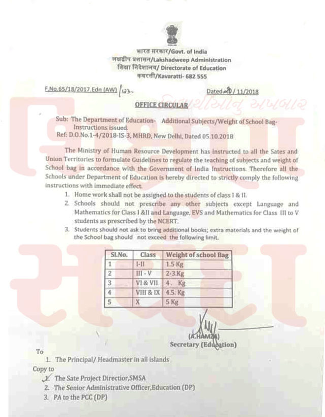કેન્દ્રીય માનવ સંસાધન મંત્રાલયે 5 ઓક્ટોબર, 2018ના રોજ આ આદેશ જાહેર કર્યો હતો. રાજ્ય સરકારો અને કેન્દ્રશાસિત પ્રદેશોની સરકારોને આ આદેશને તાત્કાલિક અસરથી લાગુ કરવાનું કહેવામાં આવ્યું છે. www.cialive.in હવે આ સંબંધે રાજ્યો અને કેન્દ્રશાસિત પ્રદેશોની સરકારો તરફથી શિક્ષણ વિભાગ અને સ્કૂલોને સર્ક્યુલર જાહેર કરવામાં આવી રહ્યા છે. જોકે, હજુ સુધી ગુજરાતમાં આ અંગે સહેજ પણ ચળવળ દેખાતી નથી. અમને જે સરક્યુલર મળ્યો છે એ કેન્દ્ર શાસિત પ્રદેશના નામનો છે. પણ આવો જ પરિપત્ર ગુજરાતમાં પણ આપવામાં આવ્યો છે પણ ગુજરાત સરકાર તેને પ્રાયોરિટીમાં લેતી ન હોવાનું હાલ તુરત જણાય રહ્યું છે.