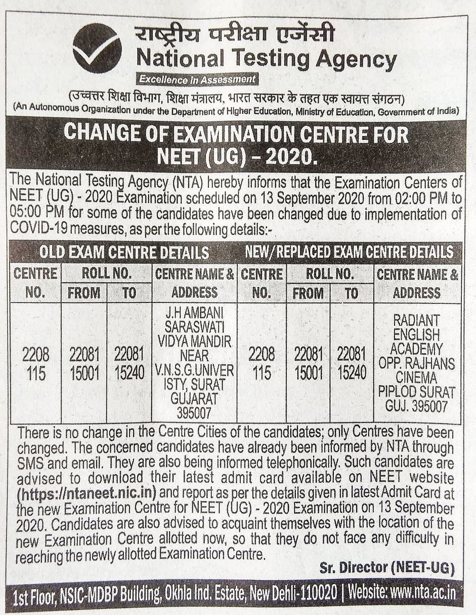 સુરત શહેર જિલ્લા કે દક્ષિણ ગુજરાતમાંથી નીટ 2020 પરીક્ષા આપી રહેલા વિદ્યાર્થીઓ અને તેમના વાલીઓ સુધી એ વાત પહોંચાડવી જરૂરી છે કે જે બાળકોની હોલ ટિકિટમાં પરીક્ષાનું કેન્દ્ર સુરત શહેરમાં યુનિવર્સિટી રોડ પર આવેલી જે.એચ. અંબાણી સ્કુલનું કેન્દ્ર દર્શાવવામાં આવ્યું છે એ પરીક્ષા કેન્દ્ર છેલ્લી ઘડીએ રદ કરવામાં આવ્યું છે. હવે જે.એચ.અંબાણી સ્કુલની જગ્યાએ પરીક્ષા કેન્દ્ર રેડીયન્ટ ઇંગ્લિશ એકેડેમી, રાજહંસ સિનેમા સામે, પીપલોદ, સુરત ખાતે બદલવામાં આવ્યું છે.