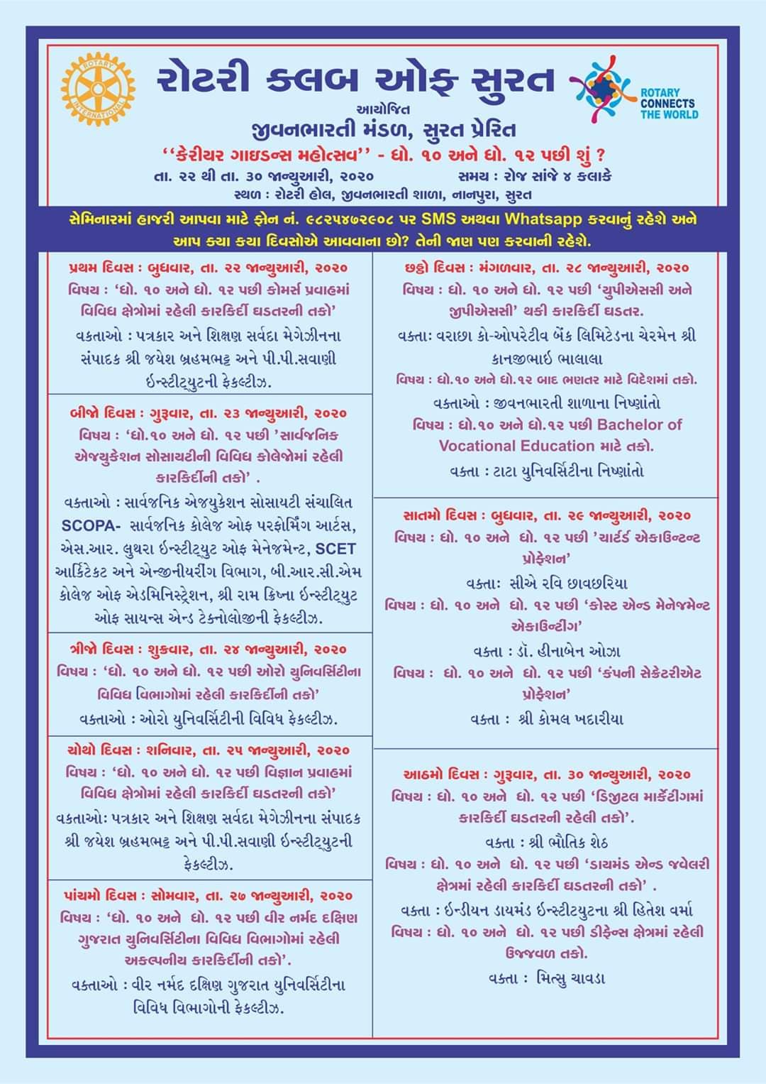 રોટરી ક્લબ ઓફ સૂરત દ્વારા જીવન ભારતી મંડળના સહયોગથી સૂરત સમેત સમગ્ર દક્ષિણ ગુજરાતના વિદ્યાર્થીઓ માટે કેરીયર ગાઇડન્સ મહોત્સવનું સમયસરનું આયોજન હાથ ધરવામાં આવ્યું છે. તા.22મી જાન્યુઆરી 2020ને બુધવારે બપોરે 4 કલાકે સૂરતના નાનપુરા સ્થિત જીવનભારતી સંકુલના રોટરી હોલ ખાતે કારકિર્દી માર્ગદર્શન મહોત્સવનો આરંભ જાણીતા કારકિર્દી માર્ગદર્શનક જયેશ બ્રહ્મભટ્ટના સેશન સાથે થયો હતો. એ પછી પી.પી. સવાણી યુનિવર્સિટીના ફેકલ્ટી ડો. તેજલ પટેલએ પીપી સવાણી યુનિવર્સિટી સંકુલમાં ચાલતા અભ્યાસક્રમો અંગે વિગતવાર ચર્ચા કરી હતી. રોટરી કલબ ઓફ સૂરતના નિખિલ મદ્રાસીએ વાલીઓ અને વિદ્યાર્થીઓને કારકિર્દી માર્ગદર્શન મહોત્સવની રૂપરેખા આપી હતી.