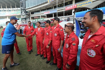 નાગપુરમાં 9/11/2019 ભારતીય હવાઈ દળની સૂર્યકિરણ ઍરોબૅટિંગ ટીમ સાથે ભારતના ક્રિકેટરો (ઉપર, રિષભ પંત તથા મનીષ પાન્ડે તેમ જ ડાબે, શિખર ધવન). હેડ-કોચ રવિ શાસ્ત્રીએ પણ પાઇલટો સાથે થોડો સમય વીતાવ્યો હતો. આ પાઇલટો ‘ઍર ફેસ્ટ ૨૦૧૯’માં ભાગ લેવા નાગપુર આવ્યા છે.