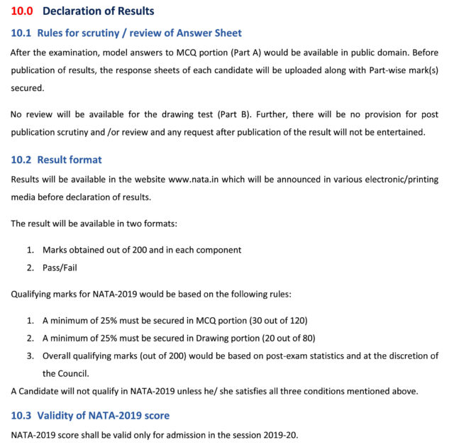 નેશનલ એપ્ટિટ્યુટ ટેસ્ટ ઇન આર્કિટેક્ચર 2019 પરીક્ષામાં કાઉન્સિલ ઓફ આર્કિટેક્ચરના વહીવટકર્તાઓએ ક્વોલિફાઇંગ લેવલ એટલે કે નાટામાં પાસ થવાનો લઘુત્તમ સ્કોર 40 ટકા હતો જેમાં પહેલી વખત ઘટાડો કરીને આ પ્રમાણ 25 ટકા કરી દેવામાં આવ્યું છે. 2018 સુધી નાટામાં પાસ થવા (બી.આર્ક.માં પ્રવેશ માટે લાયક થવા) માટે 200માંથી 80 માર્કસ અનિવાર્ય હતા. પરંતુ, હવે નાટાના બન્ને પાર્ટમાં 25 ટકા માર્કસ લાવીને કુલ 200માંથી 50 માર્કસ આવશે એટલે ઉમેદવારને બી.આર્ક.માં પ્રવેશ માટે લાયક ગણવામાં આવશે.