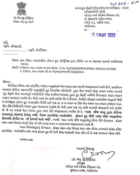 કેન્દ્રના ફૂડ સેફ્ટી એન્ડ સ્ટાન્ડર્ડર્સ ઓથોરિટી ઓફ ઇન્ડિયાએ કોલ્ડ ડ્રિક્સ, આઇસ્ક્રીમ અને ફ્રોઝન ફૂડ જેવી ખાદ્યચીજોથી કોરોના વાયરસનું સંક્રમણ થતું નથી એવી ગાઇડલાઇન્સ દરેક રાજ્યોને મોકલી આપી છે.