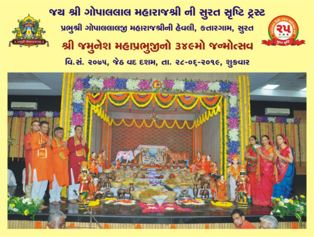 ’જય શ્રી ગોપાલલાલ મહારાજશ્રીની સુરત સૃષ્ટિ ટ્રસ્ટ-સુરત’ નિર્મિત પ્રભુશ્રી ગોપાલલાલજી ની હવેલીના પાટોત્સવના ૨૫ વર્ષ પૂરા થતાં ટ્રસ્ટ આયોજીત પાટોત્સવ મિતિ રજત મહોત્સવ વર્ષ ૨૦૧૯ – ૨૦૨૦ ના ભાગરૂપે આજ રોજ સવંત ૨૦૭૫,  જેઠ વદ દશમ તારીખઃ- ૨૮/૦૬/૨૦૧૯ શુક્રવારના રોજ શ્રી જમુનેશ મહાપ્રભુજીનો ૩૪૯માં જન્મદિન રૂપી ઓચ્છવમાં સુરત સૃષ્ટિના વૈષ્ણવોએ સુંદર સત્સંગ સાથે કુંજવારા (છપ્પનભોગ) તેમજ રાત્રે ઢાઢીલીલા નું સુંદર આયોજન કરવામા આવ્યું હતું. જેમાં હજારો વૈષ્ણવોએ જન્મોત્સવ નો લાભ લઈ આનંદ અને ખુશી વ્યકત કરી હતી.