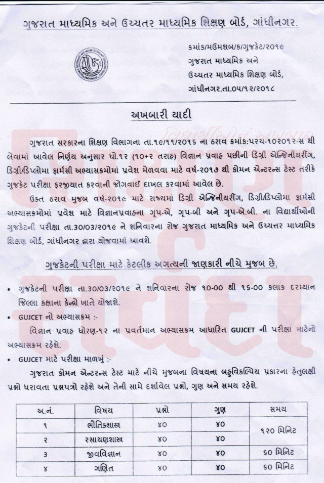 ગુજરાત ઉચ્ચતર માધ્યમિક શિક્ષણ બોર્ડ દ્વારા આજે કરાયેલી જાહેરાત અનુસાર ગુજરાત કોમન એન્ટ્રન્સ ટેસ્ટ 2019 તા.30મી માર્ચ 2018ના રોજ લેવામાં આવશે. બોર્ડે આ અંગેની સત્તાવાર જાહેરાત આ મુજબ કરી છે.