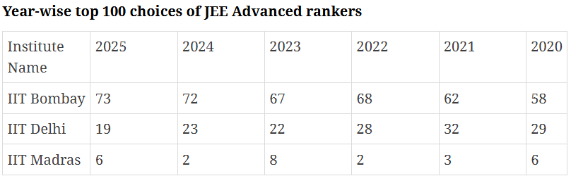 ડેટા દર્શાવે છે કે IIT બોમ્બેનું વર્ચસ્વ 2020 થી મજબૂત બન્યું છે, જ્યારે ટોચના 100 રેન્કર્સમાંથી 58 દ્વારા તેની પસંદગી કરવામાં આવી હતી. તેનો હિસ્સો દર વર્ષે સતત વધતો ગયો છે, 2024 અને 2025 બંનેમાં 70 નો આંકડો વટાવી ગયો છે.