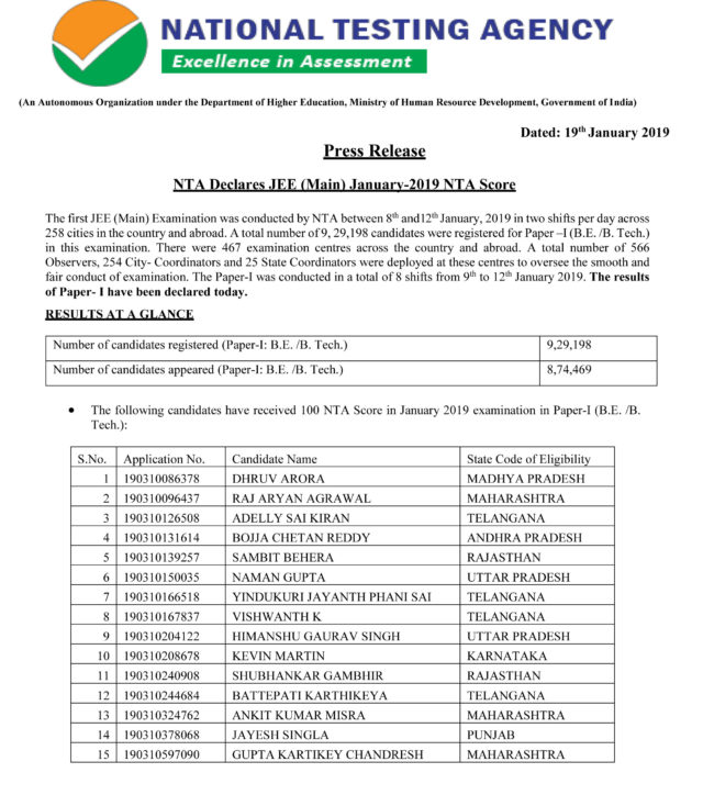 ચાલુ જાન્યુઆરી 2019 માસમાં જ નેશનલ ટેસ્ટીંગ એજન્સી દ્વારા પહેલી વખત લેવામાં આવેલી દેશની સત્તાવાર ઇજનેરી પ્રવેશ પરીક્ષા JEE Main પેપર-1 પરીક્ષાનું પરીણામ આજે આશ્ચર્યજનક રીતે જાહેર કરવામાં આવ્યું છે. ગુજરાતમાંથી ચૌતરફા રીતે મળી રહેલા પરીણામોના અહેવાલો મુજબ ગુજરાતી વિદ્યાર્થીઓનું પરીણામ અત્યંત નીચું અને કંગાળ રહ્યું છે. મોટા ભાગના વિદ્યાર્થીઓએ એવી ફરીયાદો કરી હતી કે પહેલી વખત ઓનલાઇન પરીક્ષા આપવામાં જવાબનો વિકલ્પ પસંદ કરવામાં ગોથું ખાતા જવાબો ખોટા પડ્યા હતા અને તેને કારણે કમાયેલા માર્કમાંથી કપાત થતાં માર્કસ ઓછા આવ્યા છે.