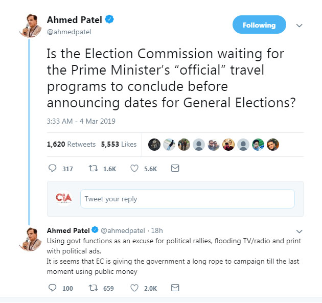 દરમિયાન કોંગ્રેસના નેતા અહેમદ પટેલએ શિવરાત્રીના દિવસે કેટલીક ટ્વીટ કરી હતી એ સૂચક છે કે ચૂંટણીની તારીખોનું એલાન નજીક આવી રહ્યું છે.