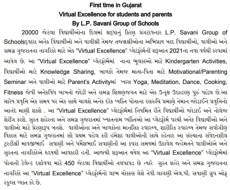 સુરતમાં લગભગ 20 હજાર જેટલા વિદ્યાર્થીઓ જેની સાથે સંકળાયેલા છે એ એલ.પી. સવાણી ગ્રુપ ઓફ સ્કુલ્સે 2021ના પહેલા જ દિવસે ઓનલાઇન સ્ટડીને આકર્ષક બનાવતા એક તરોતાજા સિસ્ટમ પોતાની સ્કુલમાં લોંચ કરી છે અને એ સિસ્ટમનું નામ છે વર્ચ્યુઅલ એક્સેલન્સ.