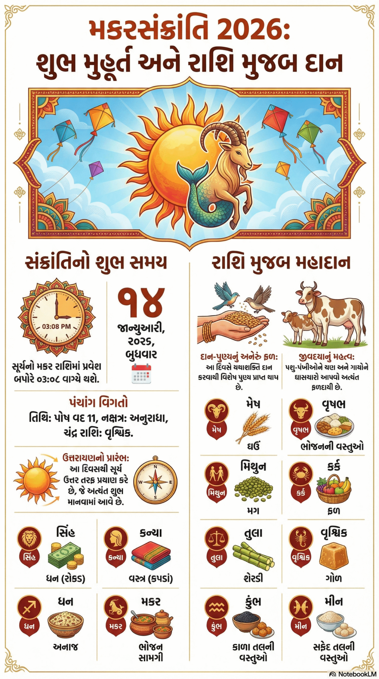 આ વર્ષે મકરસંક્રાંતિ એટલે કે સૂર્યનો મકર રાશિમાં પ્રવેશ 14 જાન્યુઆરી, 2026 ને બુધવારના રોજ થશે.