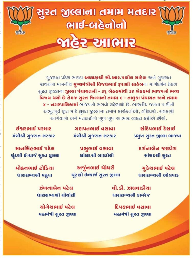 સુરત જિલ્લા ભાજપ પરિવારનું આભાર દર્શન