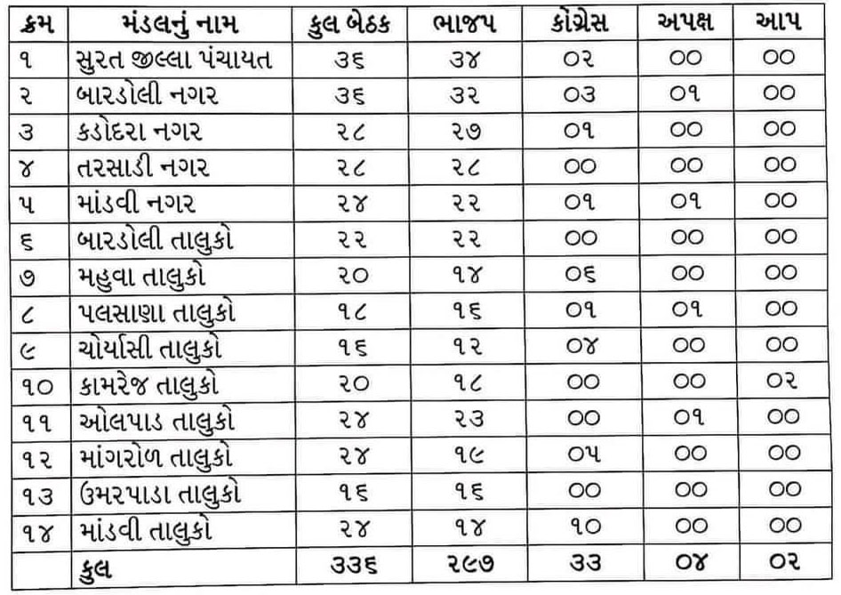 સુરત જિલ્લામાં ચૂંટણીના અંતિમ પરીણામો