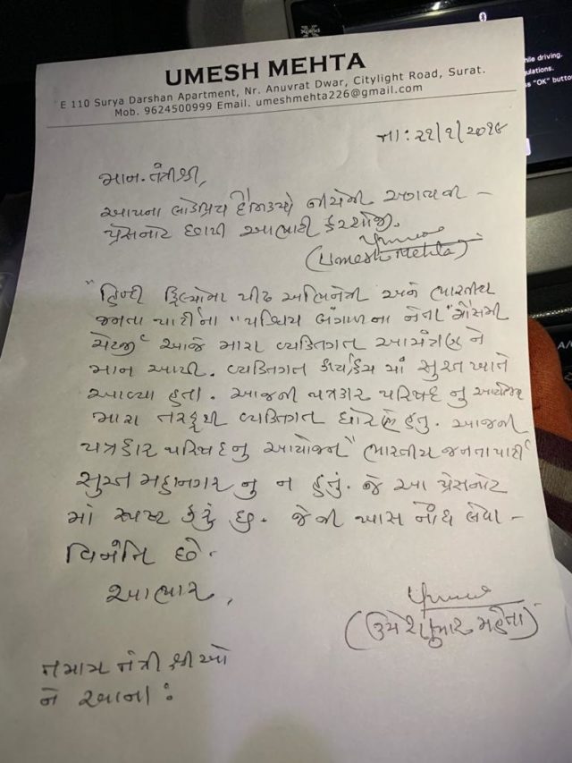 ભાજપાનું નામ વટાવવાની કોશીસ કરનાર ઉમેશ મહેતા સામે ભાજપા સુરત મહાનગર શું પગલાં ભરશે ?