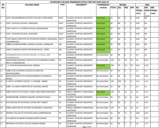 મેડીકલ પ્રવેશ સમિતિની યાદી મુજબ રાજ્યમાં કુલ 27 આયુર્વેદિક કોલેજો અસ્તિત્વમાં છે અને તેમાંથી ફક્ત 09 જ કોલેજો તા.27મી ઓગસ્ટ 2018 સુધીમાં પરમિશન ધરાવે છે, બાકીની 18 આયુર્વેદિક કોલેજો પાસે 2018-19ના વર્ષ માટેની કોઇ પરવાનગી સક્ષમ સત્તામંડળ પાસેથી મળી નથી.