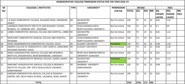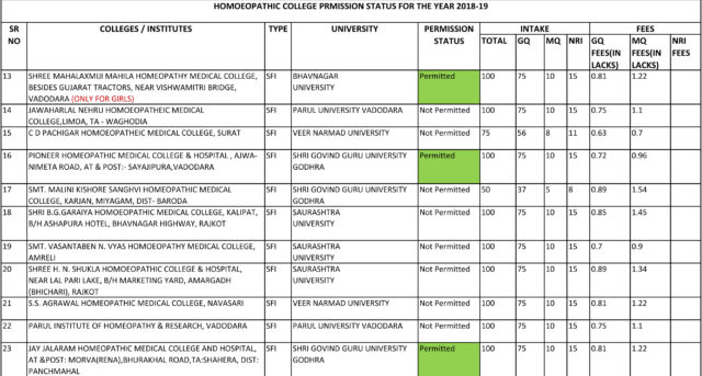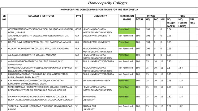 ખુદ પ્રવેશ સમિતિ જો આવી નોટ પરમિટેડ કોલેજોને પ્રવેશ યાદીમાં મૂકે ત્યારે વાલીઓ અને વિદ્યાર્થીઓએ શું સમજવું. અહીં નીચે દર્શાવેલી હોમિયોપેથી કોલેજોની યાદી જોઇએ તો રાજ્યમાં હોમિયોપેથીની કુલ 33 કોલેજ છે, પ્રવેશ સમિતિની સત્તાવાર માહિતી એવું કહે છે કે કુલ 33 હોમિયોપેથી કોલેજોમાંથી ફક્ત 11 હોમિયોપેથી કોલેજો જ ચાલુ વર્ષ માટે સક્ષમ સત્તામંડળની પરવાનગી ધરાવે છે, બાકીની કોલેજોને હજુ સુધી પરવાનગી આપવામાં આવી નથી.