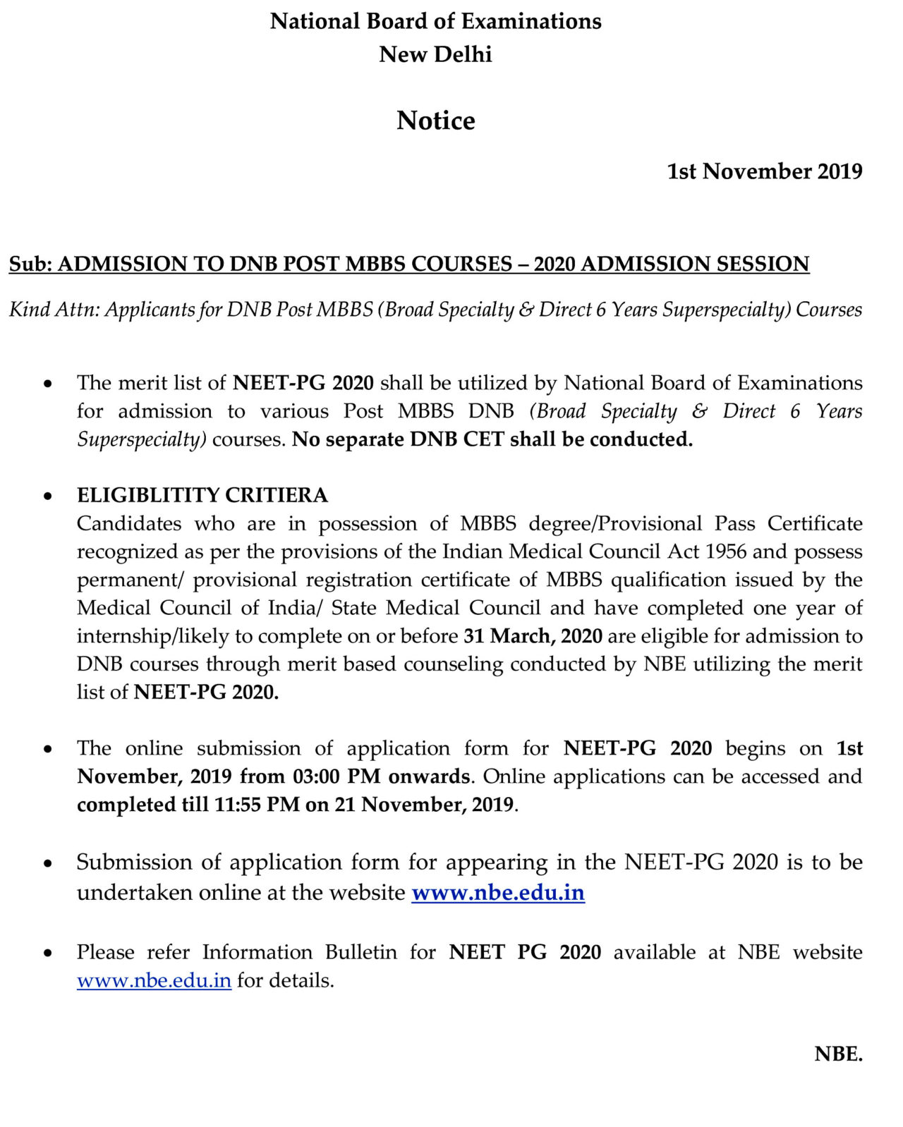 દેશભરના તબીબો ખાસ કરીને મેડીકલ ગ્રેજ્યુએશનની ડિગ્રી ધરાવતા એમ.બી.બી.એસ. ઉમેદવારો જોગ જણાવવામાં આવ્યું છે કે જે તબીબો DNB સેટ આપવા માંગતા હોય તેમણે DNB સેટ હવે લેવાવાની નથી અને નીટ પી.જી. 2020નું એપ્લિકેશન ફોર્મ ભરવું. નીટ પીજી 2020ના સ્કોરના આધારે જ Diplomate National Board (DNB) હેઠળના અભ્યાસક્રમોમાં પ્રવેશનું મેરીટ લિસ્ટ તૈયાર થશે.