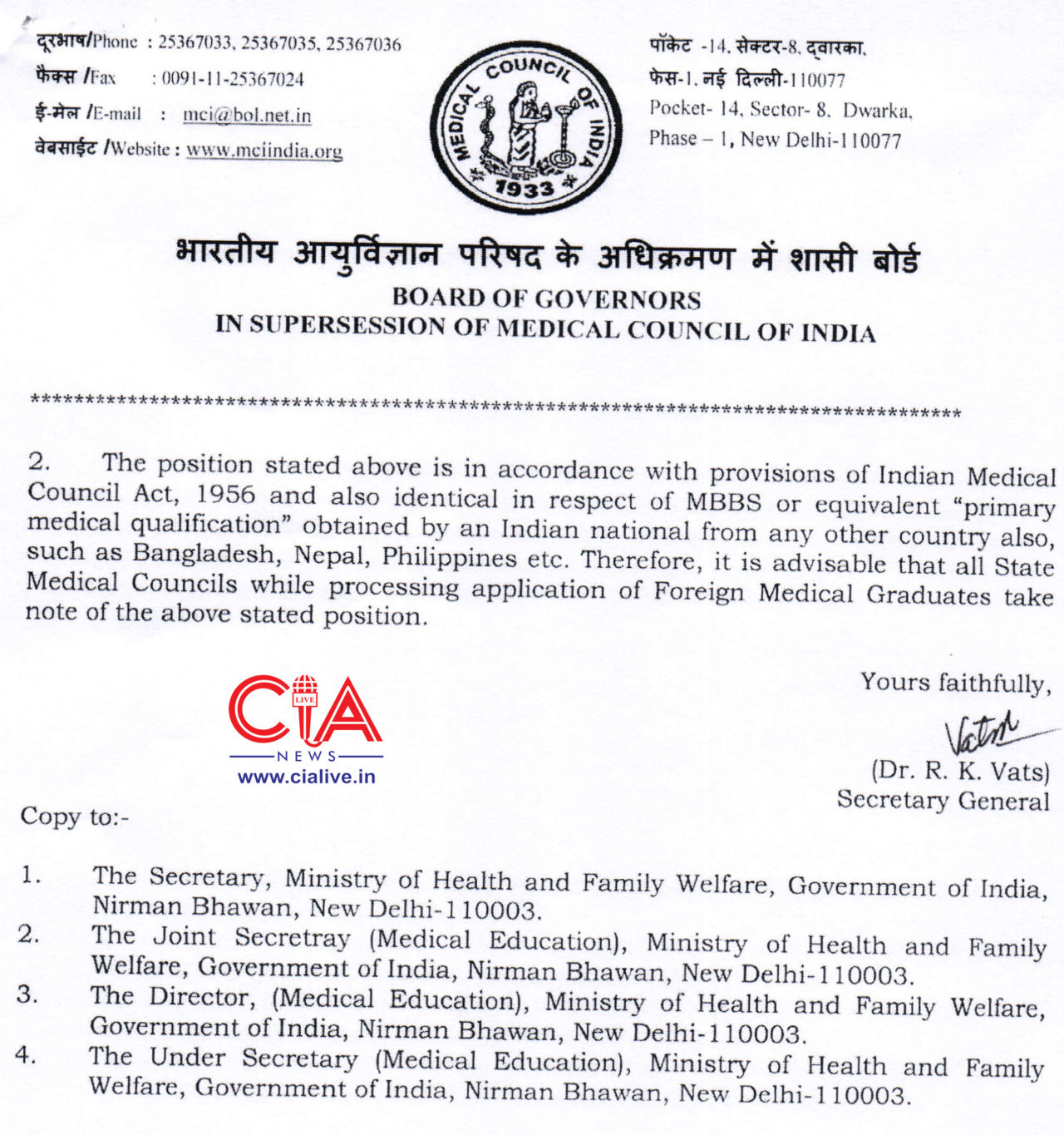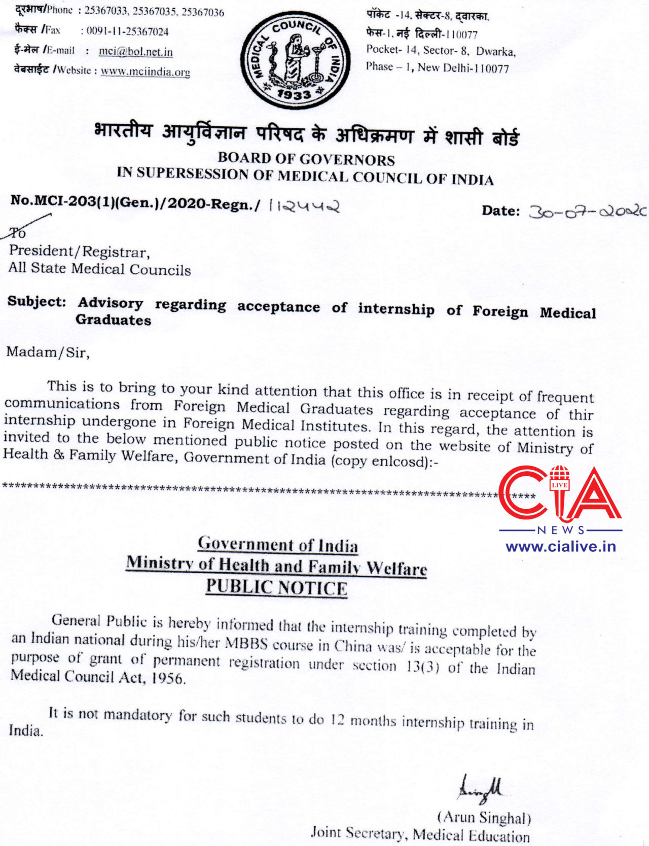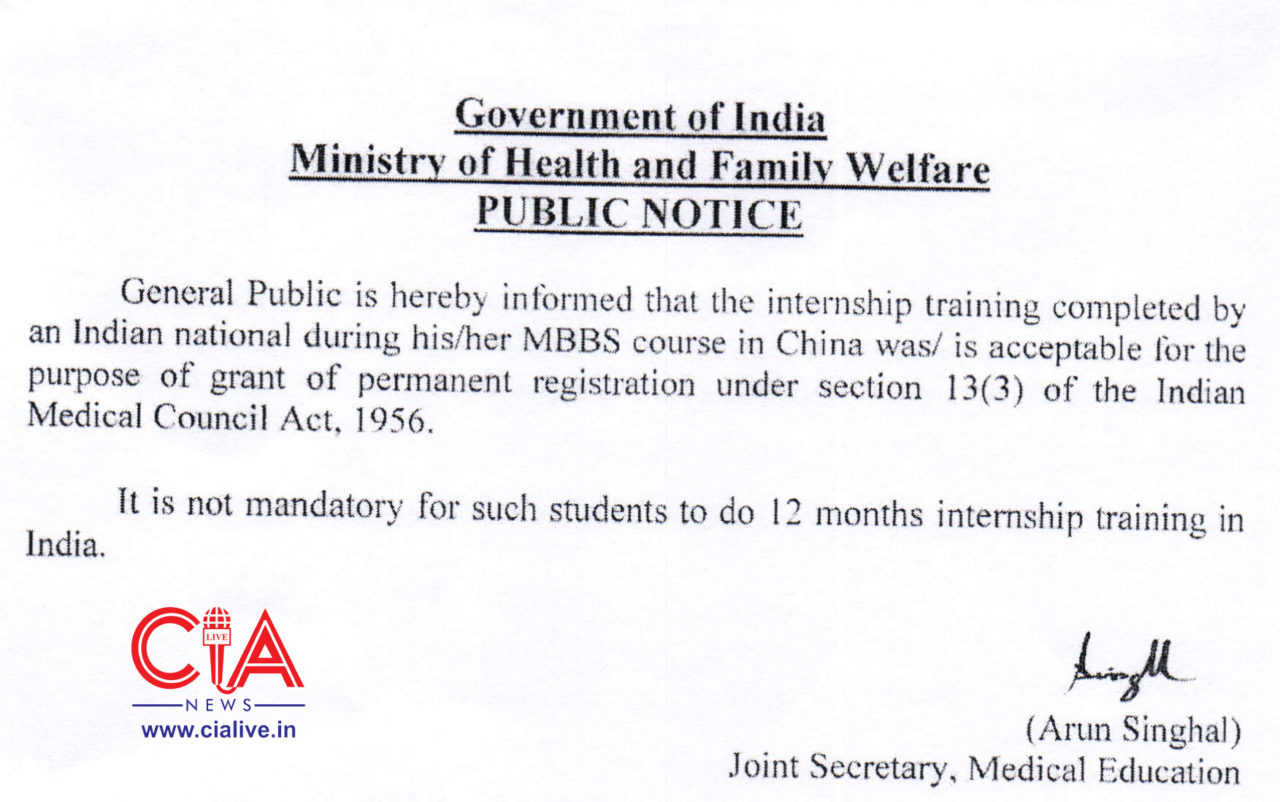 ઇન્ડિયન મેડીકલ કાઉન્સિલ એક્ટ 1956ની સેક્શન 13 (3) અન્વયે ભારત દેશમાં તબીબોનું પરમેનન્ટ રજિસ્ટ્રેશન (કાયમી નોંધણી) કરતી વખતે ફોરેન મેડીકલ ડિગ્રી ધારકોએ ભારતમાં એક વર્ષની ઇન્ટર્નશીપ ટ્રેનિંગ પૂર્ણ કરી છે કે કેમ એની ચકાસણી કરવામાં આવે છે. આ પ્રક્રિયામાંથી હવે ચાઇના તેમજ અન્ય દેશોમાંથી મેડીકલ ડિગ્રી ધરાવનાર અને વિદેશમાં જ એક વર્ષની ઇન્ટર્નશીપ ટ્રેનિંગ પૂર્ણ કરનાર ઉમેદવારોનું ભારતમાં તબીબ તરીકે પરમેન્ટન્ટ રજિસ્ટ્રેશન કરી આપવામાં આવશે.