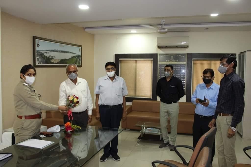 ધી સધર્ન ગુજરાત ચેમ્બર ઓફ કોમર્સ એન્ડ ઇન્ડસ્ટ્રીના કાર્યવાહક પ્રમુખ શ્રી દિનેશભાઈ નાવડીયાએ આજરોજ તા.6 ઓગસ્ટ 2020ના રોજ સુરત શહેરના નવા પોલીસ કમિશ્નર શ્રી અજય તોમરની શુભેચ્છા મુલાકાત લીધી હતી. આ મુલાકાત દરમ્યાન ચેમ્બરના કાર્યવાહક પ્રમુખ શ્રી દિનેશભાઈ નાવડીયાએ ઔદ્યોગિક વિસ્તારોમાં દિવસ અને રાત્રિના સમયે પેટ્રોલીંગ સખત કરવાની ભારપૂર્વક રજૂઆત કરી હતી.