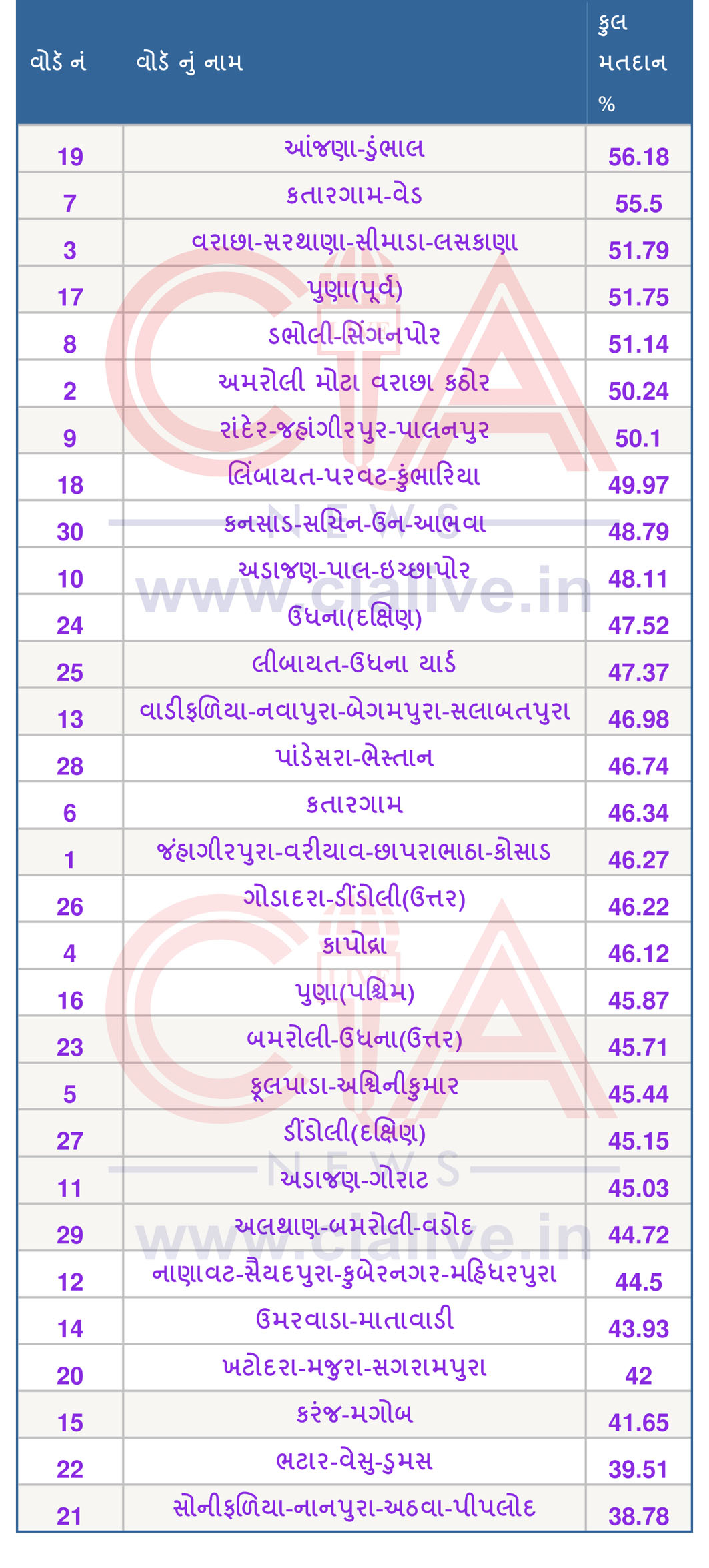 સુરત મહાનગરપાલિકાની ચૂંટણીનું વોર્ડવાઇઝ મતદાન
