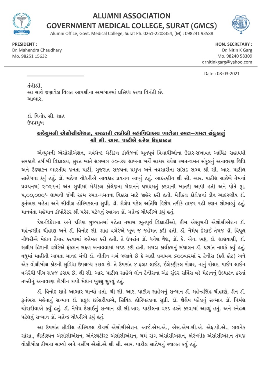 સુરતની સરકારી મેડીકલ કોલેજમાં અભ્યાસ કરીને હાલમાં સુરત તેમજ સમગ્ર ગુજરાત, ભારત અને વિદેશમાં સ્થાયી થયેલા હોય તેવા પૂર્વ વિદ્યાર્થીઓના સંગઠન, એલ્યુમની એસોસીએશન, સરકારી તબીબી મહાવિદ્યાલય, સુરત દ્વારા તાજેતરમાં સિવિલ હોસ્પિટલ સંકુલમાં રમત-ગમત સંકુલનું ઉદઘાટન ગુજરાતના બીજેપી પ્રમુખ સી.આર. પાટીલના હસ્તે ઉદઘાટિત કરવામાં આવ્યું છે. આ મલ્ટીપર્પઝ સ્પોર્ટસ સંકુલ મેડીકલનો અભ્યાસ કરી રહેલા અને ભવિષ્યમાં કરનારા વિદ્યાર્થીઓ માટે અત્યંત અનિવાર્ય હતું, જેને પૂર્વ વિદ્યાર્થીઓએ પોતાનું ઋણ અદા કરતા હોય એ રીતે ચૂકવ્યું છે. સુરતની સરકારી મેડીકલ કોલેજમાંથી તબીબ બનેલા ભૂતપૂર્વ વિદ્યાર્થીઓએ એકત્રિત કરેલા ભંડોળમાંથી રૂ.32 લાખના માતબર ખર્ચે આ સ્પોર્ટસ સંકુલ સાકારિત કરવામાં આવ્યું છે.