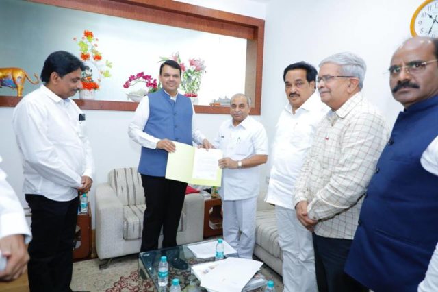 (મહારાષ્ટ્રના મુખ્યમંત્રી દેવેન્દ્ર ફડણવીસને સ્ટેચ્યુ ઓફ યુનિટીના ઉદઘાટન સમારોહની આમંત્રણ પત્રિકા આપી રહેલા ગુજરાતના નાયબ મુખ્યમંત્રી શ્રી નીતિન પટેલ સાથે સુરતના નેતા નવસારીના સાંસદ શ્રી સી.આર. પાટીલ તેમજ અન્ય દ્રશ્યમાન છે.)