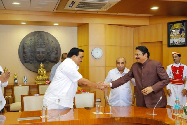 (મહારાષ્ટ્રના રાજ્યપાલ શ્રી ચેનાની વિદ્યાસાગર રાવને સ્ટેચ્યુ ઓફ યુનિટીના ઉદઘાટન સમારોહની આમંત્રણ પત્રિકા આપી રહેલા ગુજરાતના નાયબ મુખ્યમંત્રી શ્રી નીતિન પટેલ સાથે સુરતના નેતા નવસારીના સાંસદ શ્રી સી.આર. પાટીલ તેમજ અન્ય દ્રશ્યમાન છે.)