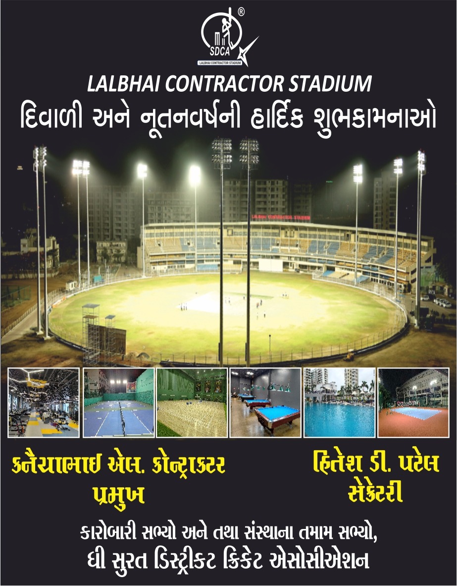 SDCA સુરત ડિસ્ટ્રીક્ટ ક્રિકેટ એસોસીએશન તરફથી તમામને દીવાળી અને નૂતન વર્ષની શુભેચ્છાઓ પાઠવવામાં આવે છે.