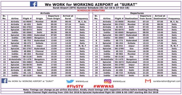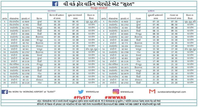 ધંધાકીય શહેર હોવાથી સુરતમાં રોજેરોજ હજારો મુલાકાતીઓ સમગ્ર દેશ દુનિયામાંથી આવે છે એવી જ રીતે સ્થાનિક સુરતીઓ પણ રોજેરોજ હજારોની સંખ્યામાં સુરતથી દેશના અન્ય શહેરો, વિદેશોમાં જાય છે. આવી સ્થિતિમાં મુલાકાતીઓને સુરત એરપોર્ટ પર આવતી જતી ફ્લાઇટ્સની માહિતી માટે અત્રે ટાઇમ ટેબલ હિન્દી, ગુજરાતી અને અંગ્રેજીમાં રજૂ કરી રહ્યા છીએ.