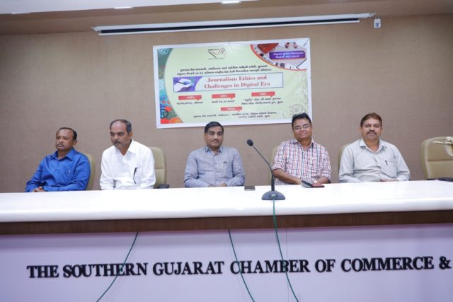 ગુજરાત પ્રેસ અકાદમી, ગાંધીનગર અને પ્રાદેશિક માહિતી કચેરી, સુરતના સંયુકત ઉપક્રમે પ્રેસ-ડેની ઉજવણીના ભાગરૂપે ‘‘ડીજીટલ યુગમાં પત્રકારત્વના સિધ્ધાંતો અને પડકારો’’ વિષય પર પ્રિન્ટ/ઈલેકટ્રોનિકસ અને ડીજીટલ મીડિયાના તંત્રીશ્રી/પ્રતિનિધિશ્રીઓની ઉપસ્થિતિમાં ચેમ્બર કોમર્સના સમૃધ્ધિ હોલ ખાતે સેમિનાર યોજાયો હતો.