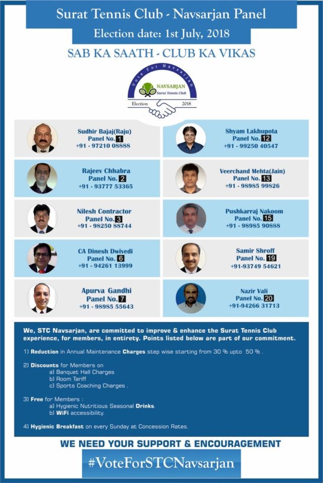 સુરત ટેનિસ ક્લબમાં હાલમાં સત્તા ધરાવતા પરિવર્તન પેનલની સામે ક્લબના જ કેટલાક મેમ્બર્સે ભેગા મળીને એક ધરી રચી છે અા ધરીનું નામ STC નવસર્જન પેનલ રાખવામાં આવ્યું છે. નવસર્જન પેનલમાં સુધીર બજાજ, સી.એ. દિનેશ દ્વિવેદી, શ્યામ લખુપોટા, સમીર શ્રોફ, પુષ્કર રાજ નકુમ, રાજીવ છાબરા, અપૂર્વ ગાંધી, વીરચંદ મહેતા, નઝીર વલી, નિલેખ કોન્ટ્રાક્ટરનો સમાવેસ થાય છે. આ પેનલ મતદારોને વધુ કાર્યક્ષમ વહીવટ તેમજ વધુ લાભો મેમ્બર્સને મળે તેવા પ્રયાસો કરવાનો કોલ આપી રહ્યું છે. STC નવસર્જન પેનલનું આ પોસ્ટર હાલ સોશ્યલ મિડીયા મારફતે સુરત ટેનિસ ક્લબના મેમ્બર્સને મોકલવામાં આવી રહ્યું છે.