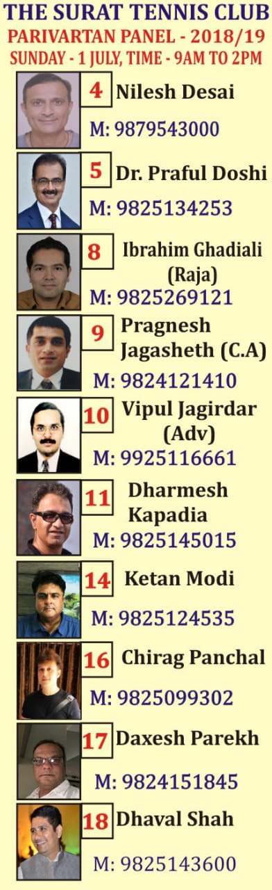 સુરત ટેનિસ ક્લબની ચૂંટણીમાં બન્ને પેનલના નામો જોતા દરેકે દરેક વ્યક્તિ સમાજમાં પોતાની અલગ પ્રતિભા ધરાવે છે. ટેનિસ ક્લબની આ ચૂંટણી એટલા માટે જ કહેવાય છે કે પ્રતિષ્ઠાભરી બની છે કેમકે લબ્ધ પ્રતિષ્ઠિત લોકો વચ્ચે આ ચૂંટણી જંગ લેખાઇ રહ્યો છે.