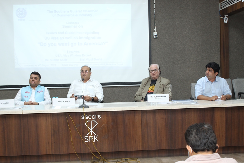 ધી સધર્ન ગુજરાત ચેમ્બર ઓફ કોમર્સ એન્ડ ઇન્ડસ્ટ્રી દ્વારા બુધવાર, તા. ૪ ઓગષ્ટ ર૦ર૧ના રોજ સાંજે ૬:૦૦ કલાકે સમૃદ્ધિ, નાનપુરા, સુરત ખાતે ‘અમેરિકા જવું છે?’ વિષય ઉપર સેમિનારનું આયોજન કરવામાં આવ્યું હતું. જેમાં યુ.એસ.એ. વિઝા વિન્ડોના એકસપર્ટ ડો. સુધીર શાહ અને વિપુલ દોશીએ માર્ગદર્શન આપ્યું હતું.