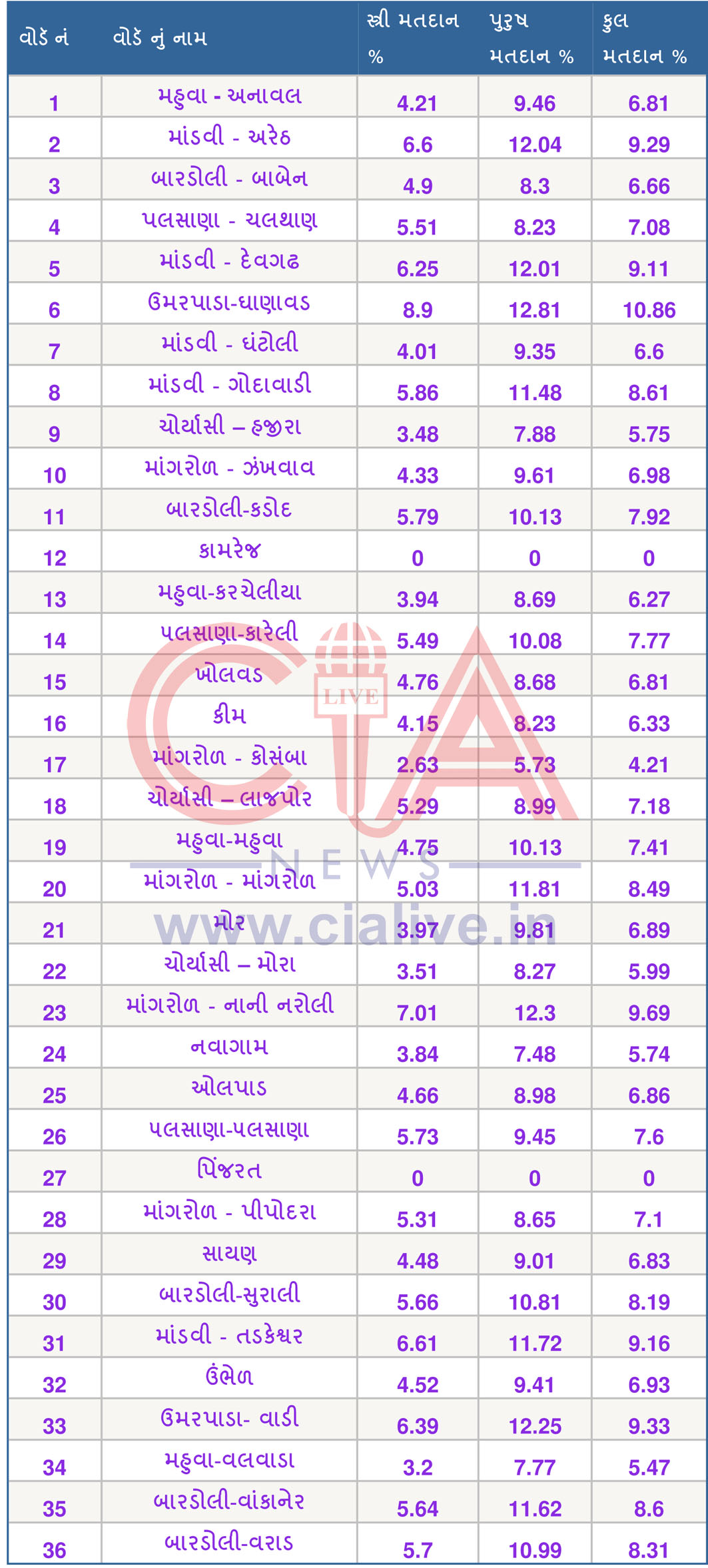 | BARDOLI | 9 | 6039 | 4812 | 10851 | 21.48 |